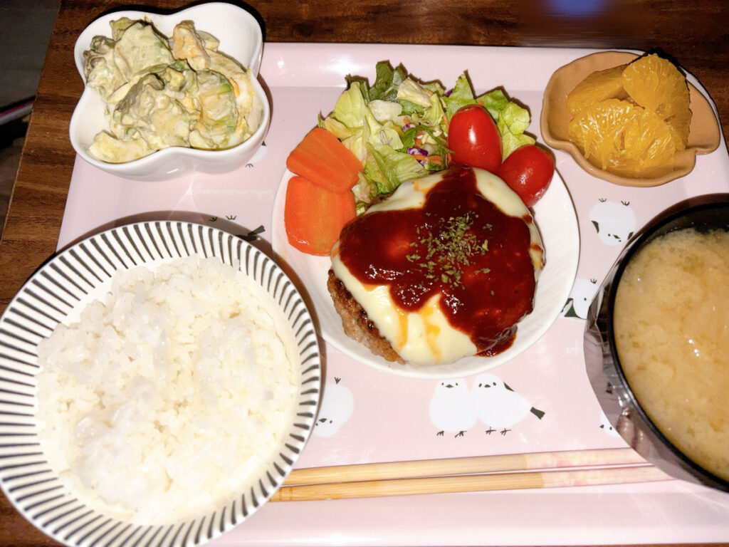 チーズハンバーグ/アボカドと卵のサラダ/八朔