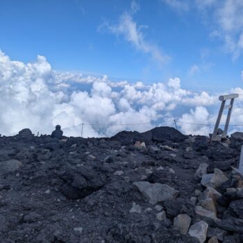 当日は天気にも恵まれ、登山日和でした☀️。変わらない景色の中、ひたすら坂道を進み、急な岩場は手と足を使ってよじ登りました。足はだんだん疲れていきましたが、登山そのものは楽しく、「楽しいなぁ」と思いながら一歩一歩進むことができました。結果、なんと約4時間で頂上に到着。山頂からの景色は絶景で、とくに「お鉢」と呼ばれる火口の迫力には圧倒されました。
