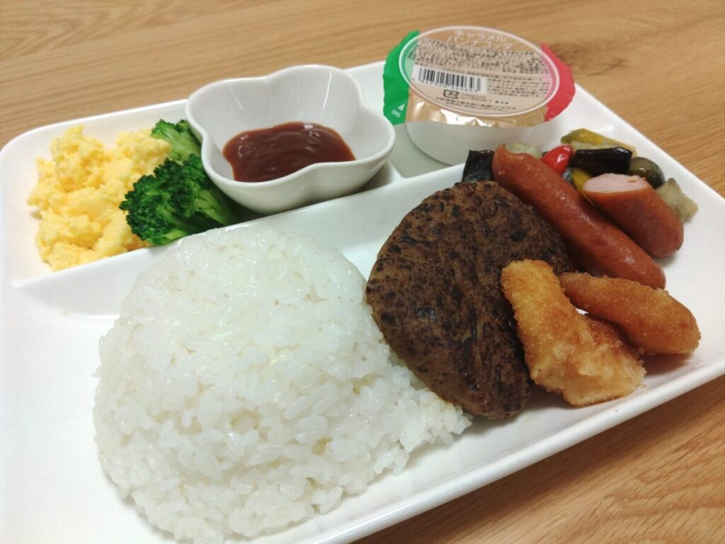 ハンバーグとエビフライ、ウインナーとスクランブルエッグに彩り野菜をワンプレートにしています。