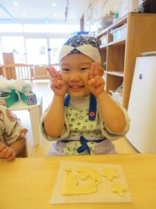 事前に小麦粉粘土で型抜きの練習もして、